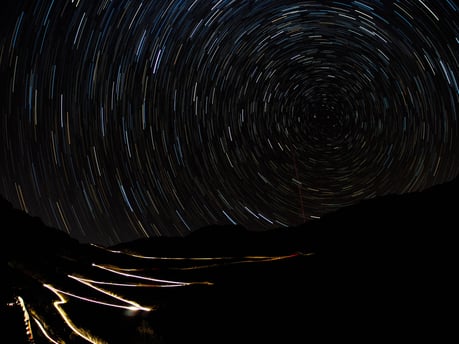 Die Erdachse zeigt fast genau auf den Polarstern. Während sich die Erde mit uns um diese Achse dreht, haben wir das magische Gefühl, als würden wir stillstehen und sich der Sternenhimmel um uns drehen. Dieser faszinierende Effekt führt bei langer Belichtungszeit zu Startrails (Sternenspuren), die je nach Ausrichtung der Kamera und Brennweite als gebogene Linien oder Sternenkreise verlaufen.